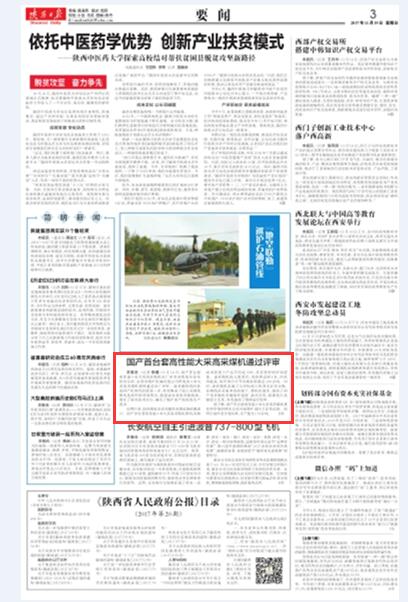 陜西日?qǐng)?bào):國(guó)產(chǎn)首臺(tái)套高性能大采高采煤機(jī)通過(guò)評(píng)審