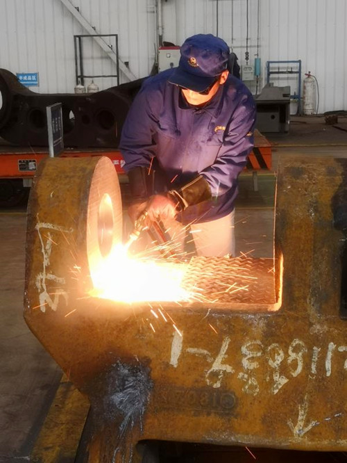 采煤機(jī)機(jī)殼N112010101-1G、N01110101G,單件重量達(dá)12噸,因工件較大,清理難度大,干活時(shí)只能爬進(jìn)機(jī)殼內(nèi)進(jìn)行氣割。由于內(nèi)腔過(guò)小,內(nèi)腔粘沙,在清理過(guò)程中,氣割及打磨時(shí)溫度過(guò)高,產(chǎn)生的氣體不易散發(fā),加之趴著干活,石富強(qiáng)、張偉群、張宗玲等師傅輪流上陣,即使上有除塵器,面帶防護(hù)罩,每次干完活他們?nèi)匀槐呛谀樑K。即便脖子、雙臂有了疤痕,但鑄件上的每一個(gè)缺陷、每一個(gè)瑕疵,生產(chǎn)中的每一個(gè)缺失,技術(shù)上的每一個(gè)不足,清砂人絕不會(huì)放過(guò)。為了同一個(gè)目標(biāo),清砂工人就像駱駝上路,只知向前,絕不躊躇。