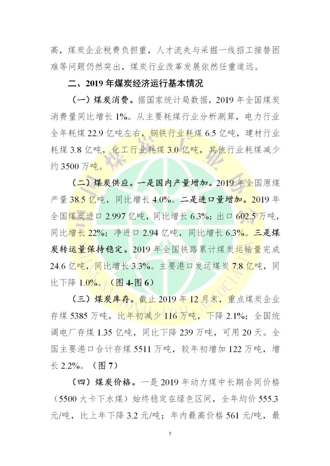 報(bào)告回顧了2019年煤炭經(jīng)濟(jì)運(yùn)行情況。一是煤炭消費(fèi)和供應(yīng)增加。全國(guó)煤炭消費(fèi)量同比增長(zhǎng)1%;全國(guó)原煤產(chǎn)量同比增長(zhǎng)4.0%;全國(guó)煤炭?jī)暨M(jìn)口增長(zhǎng)6.3%。二是煤炭庫(kù)存保持在合理水平。年末,重點(diǎn)煤炭企業(yè)存煤5385萬(wàn)噸,全國(guó)統(tǒng)調(diào)電廠存煤1.35億噸,全國(guó)主要港口合計(jì)存煤5511萬(wàn)噸。三是煤炭?jī)r(jià)格平穩(wěn)。2019年動(dòng)力煤中長(zhǎng)期合同價(jià)格(5500大卡下水煤)始終穩(wěn)定在綠色區(qū)間,全年均價(jià)555.3元/噸,同比下降3.2元/噸。四是行業(yè)效益持續(xù)好轉(zhuǎn)。全國(guó)規(guī)模以上煤炭企業(yè)實(shí)現(xiàn)利潤(rùn)2830.3億元。五是固定資產(chǎn)投資增加。煤炭采選業(yè)固定資產(chǎn)投資同比增長(zhǎng)29.6%。