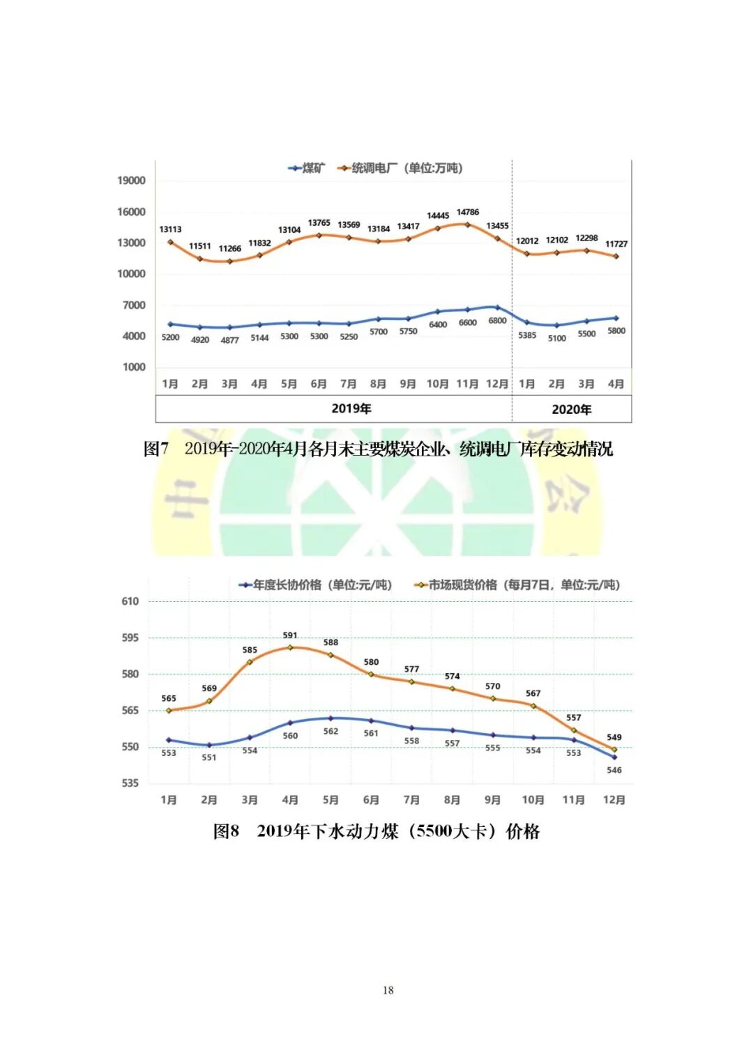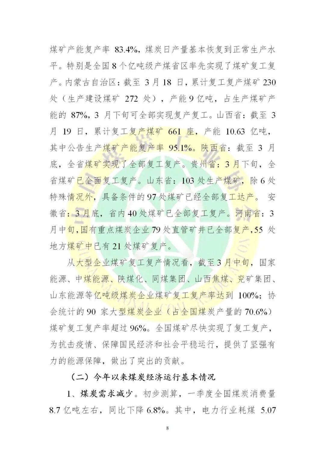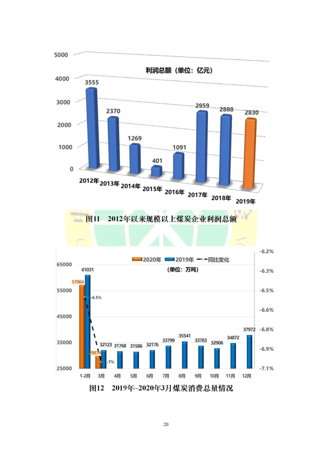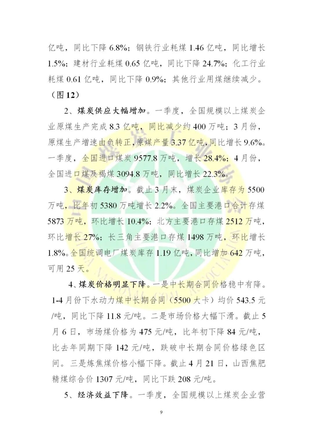 報(bào)告分析了2020年1-4月煤炭經(jīng)濟(jì)運(yùn)行基本情況,展望了今后一個(gè)時(shí)期煤炭市場(chǎng)走勢(shì)。一是煤炭需求減少。一季度全國(guó)煤炭消費(fèi)量8.7億噸左右,同比下降6.8%。二是煤炭供應(yīng)大幅增加。一季度,全國(guó)規(guī)模以上煤炭企業(yè)原煤生產(chǎn)完成8.3億噸,同比減少約400萬(wàn)噸。三是煤炭庫(kù)存增加。截止3月末,煤炭企業(yè)庫(kù)存為5500萬(wàn)噸,比年初5380萬(wàn)噸增長(zhǎng)2.2%。四是煤炭?jī)r(jià)格明顯下降。截止5月6日,市場(chǎng)煤價(jià)格為475元/噸,比年初下降84元/噸,比去年同期下降142元/噸,跌破中長(zhǎng)期合同價(jià)格綠色區(qū)間。五是經(jīng)濟(jì)效益下降。一季度,全國(guó)規(guī)模以上煤炭企業(yè)營(yíng)業(yè)收入4290.7億元,同比下降12.7%;實(shí)現(xiàn)利潤(rùn)421.1億元,同比下降29.9%。初步預(yù)計(jì),下半年,隨著“六穩(wěn)”、“六保”工作穩(wěn)步推進(jìn),擴(kuò)大內(nèi)需政策落地,工業(yè)和經(jīng)濟(jì)增長(zhǎng)速度將恢復(fù)到應(yīng)有水平,煤炭總需求將會(huì)好于上半年。