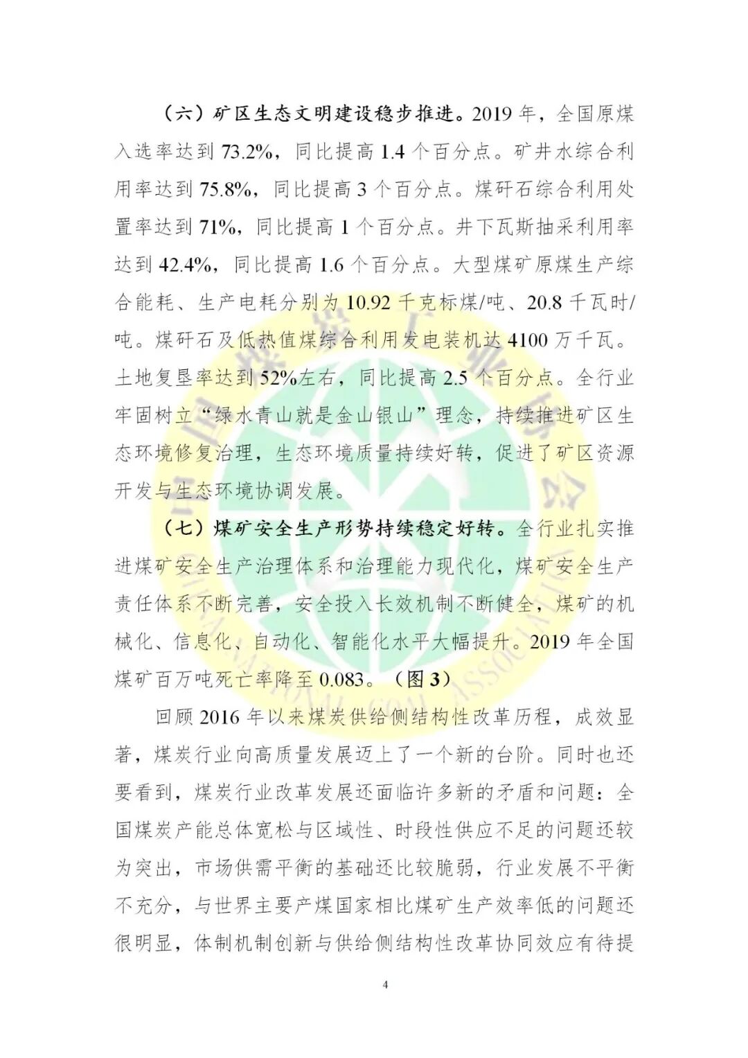 報(bào)告總結(jié)了2019年煤炭行業(yè)改革發(fā)展,一是煤炭供給側(cè)結(jié)構(gòu)性改革取得顯著成效。截至2019年底,累計(jì)退出煤炭落后產(chǎn)能9億噸/年以上,安置職工100萬(wàn)人左右。二是煤炭開發(fā)布局持續(xù)優(yōu)化。2019年,內(nèi)蒙古、山西、陜西、新疆、貴州、山東、安徽、河南等8個(gè)省(區(qū))原煤產(chǎn)量占全國(guó)的89.1%,同比提高1.2個(gè)百分點(diǎn)。三是產(chǎn)業(yè)結(jié)構(gòu)調(diào)整取得新進(jìn)展。全國(guó)煤礦數(shù)量減少到5300處左右,建成了千萬(wàn)噸級(jí)煤礦44處、200多個(gè)智能化采煤工作面。煤炭上下游產(chǎn)業(yè)一體化發(fā)展成效明顯,新能源、新材料、科技環(huán)保、現(xiàn)代金融等產(chǎn)業(yè)快速發(fā)展,推動(dòng)了行業(yè)發(fā)展動(dòng)能加快轉(zhuǎn)換。四是煤炭科技創(chuàng)新能力顯著增強(qiáng)。煤炭行業(yè)開放型創(chuàng)新體系日趨完善,煤炭基礎(chǔ)研究和關(guān)鍵技術(shù)攻關(guān)不斷取得新突破。五是煤炭市場(chǎng)化改革穩(wěn)步推進(jìn)。煤炭交易市場(chǎng)建設(shè)持續(xù)深化,中國(guó)煤炭?jī)r(jià)格指數(shù)體系不斷完善,煤炭上下游行業(yè)企業(yè)共同推動(dòng)形成的“中長(zhǎng)期合同”制度和“基礎(chǔ)價(jià)+浮動(dòng)價(jià)”定價(jià)機(jī)制,發(fā)揮了維護(hù)煤炭經(jīng)濟(jì)平穩(wěn)運(yùn)行的壓艙石作用。六是礦區(qū)生態(tài)文明建設(shè)穩(wěn)步推進(jìn)。全行業(yè)牢固樹立“綠水青山就是金山銀山”理念,持續(xù)推進(jìn)礦區(qū)生態(tài)環(huán)境修復(fù)治理,生態(tài)環(huán)境質(zhì)量持續(xù)好轉(zhuǎn),促進(jìn)了礦區(qū)資源開發(fā)與生態(tài)環(huán)境協(xié)調(diào)發(fā)展。七是煤礦安全生產(chǎn)形勢(shì)持續(xù)穩(wěn)定好轉(zhuǎn)。2019年全國(guó)煤礦百萬(wàn)噸死亡率降至0.083。