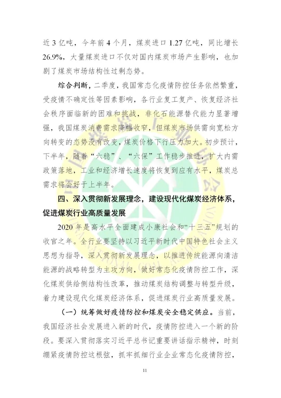 報(bào)告強(qiáng)調(diào),2020年是高水平全面建成小康社會(huì)和“十三五”規(guī)劃的收官之年。全行業(yè)要以習(xí)近平新時(shí)代中國(guó)特色社會(huì)主義思想為指導(dǎo),深入貫徹新發(fā)展理念,以推進(jìn)傳統(tǒng)能源向清潔能源的戰(zhàn)略轉(zhuǎn)型為主攻方向,要統(tǒng)籌做好疫情防控和煤炭安全穩(wěn)定供應(yīng),深入推進(jìn)煤炭供給側(cè)結(jié)構(gòu)性改革,著力提升科技實(shí)力和創(chuàng)新能力,加快推進(jìn)煤炭產(chǎn)業(yè)轉(zhuǎn)型升級(jí),加快推進(jìn)現(xiàn)代煤炭市場(chǎng)體系建設(shè),深入推進(jìn)生態(tài)文明礦山建設(shè),著力建設(shè)現(xiàn)代化煤炭經(jīng)濟(jì)體系,促進(jìn)煤炭行業(yè)高質(zhì)量發(fā)展。