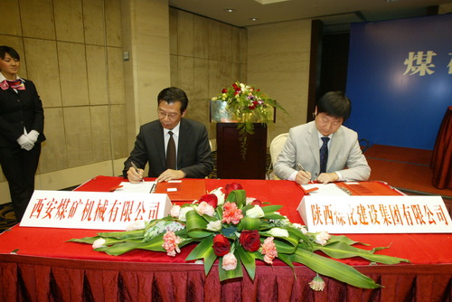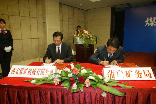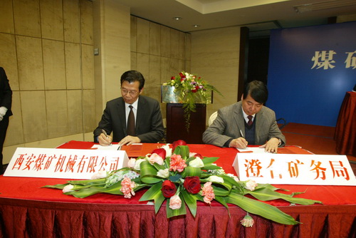 產(chǎn)品介紹結(jié)束后,蒲白礦務局、澄河礦務局、陜西煤化建設集團有限公司領(lǐng)導在會上與西安煤礦機械有限公司副總經(jīng)理王力分別簽署了掘進機購機合同。