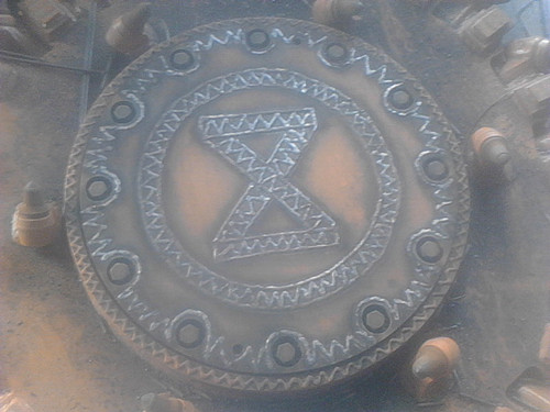 采煤機螺旋滾筒原先光禿禿的端蓋平面,用耐磨焊絲焊上西煤機注冊商標形狀的耐磨層,不但端