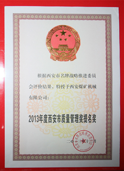 近日,在西安市名牌戰(zhàn)略推進(jìn)委員會開展的西安市質(zhì)量管理獎評定中,西安煤機(jī)公司榮獲“2013年度西安市質(zhì)量管理獎提名獎”,“西煤機(jī)牌”系列采煤機(jī)被認(rèn)定為“西安市名牌產(chǎn)品”。